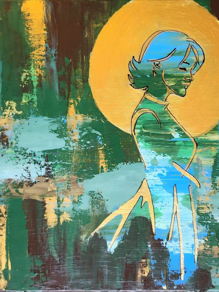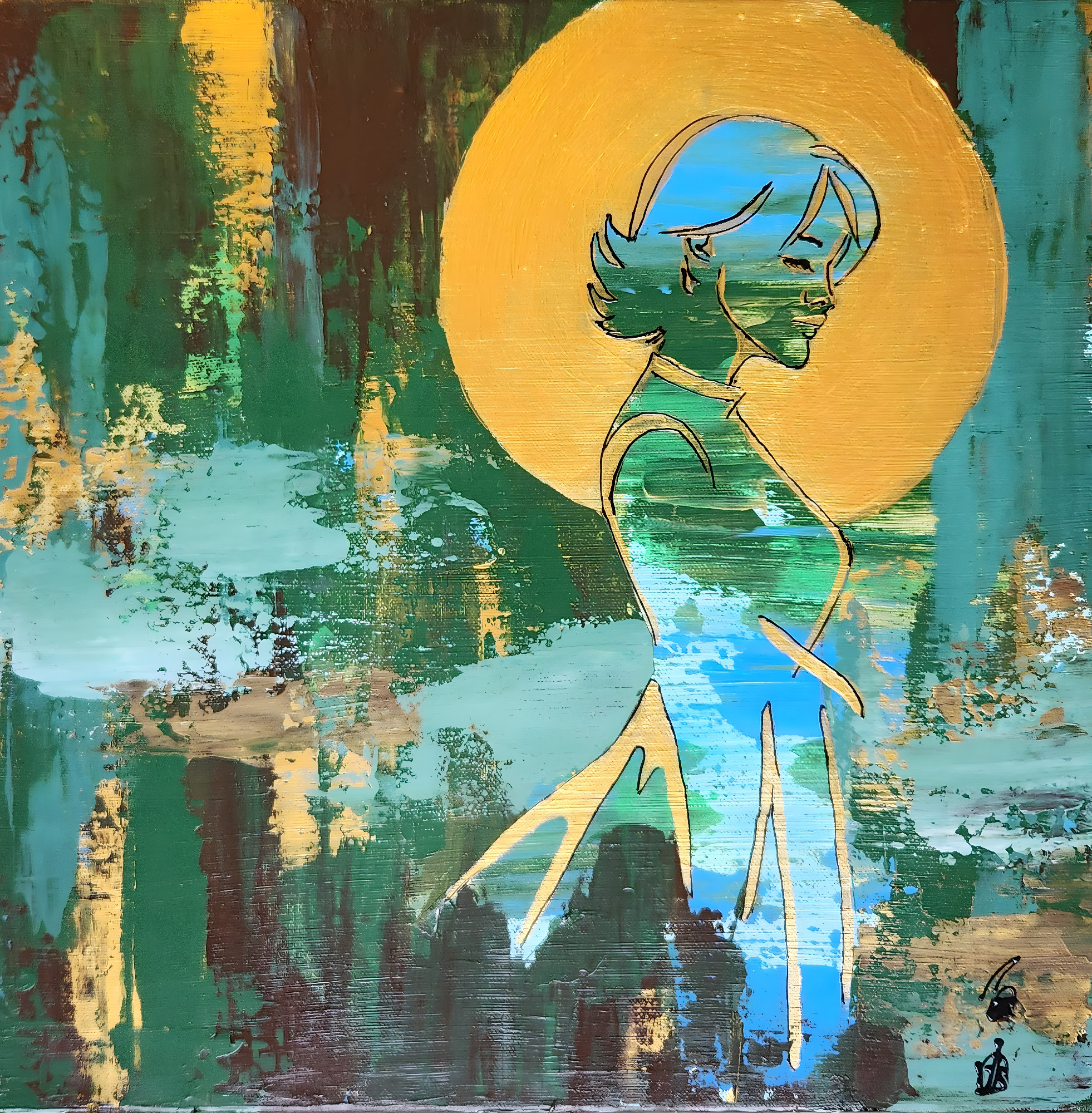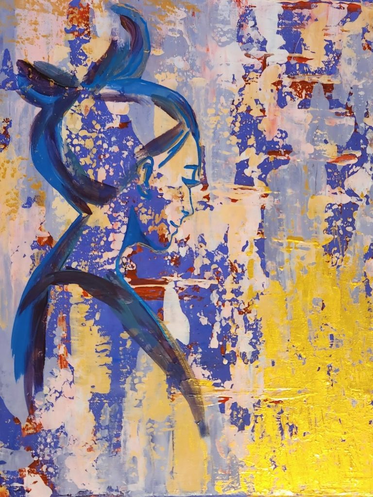 Layers of soft color and textured light settle gently on the surface, while a slender blue silhouette and a quiet field of gold create a sense of presence that feels both held and open. The painting carries a calm warmth, inviting attention without demand, like a moment of recognition that arrives before it is named. It rests naturally in spaces where stillness is valued and where looking becomes a form of listening.