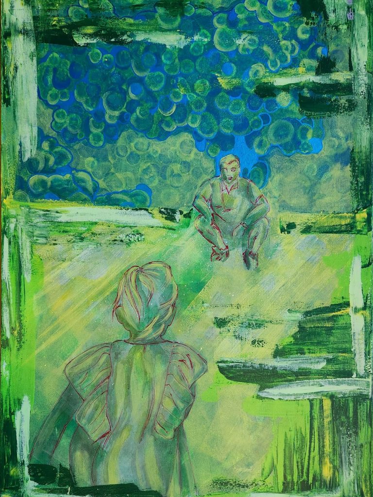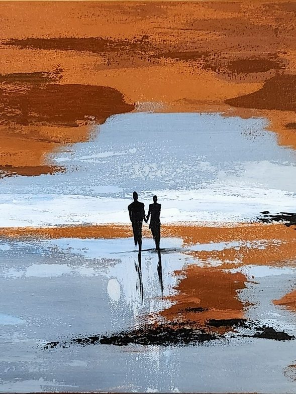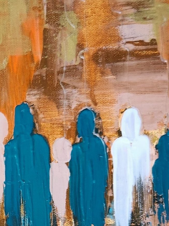 Soft layers of teal, earth and light settle into the surface, allowing the figures and their fine vertical lines to emerge slowly, as if the wall itself were breathing them into view. The painting holds a quiet tension between closeness and distance, inviting a reflective pause where connection is felt rather than explained. It seems to belong in a space that values stillness and attention, where looking becomes a gentle practice rather than a task.