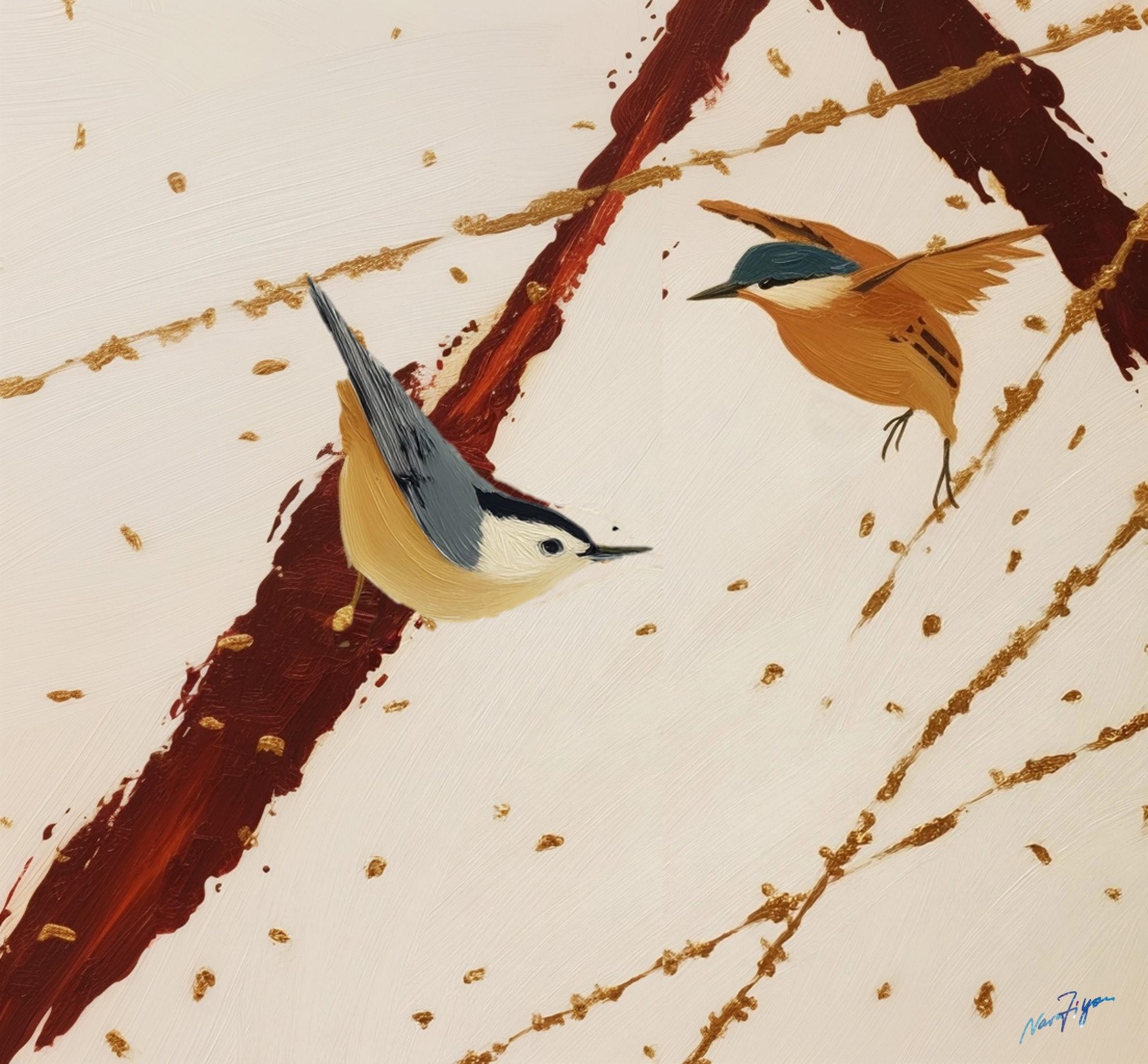 Two kingfishers hover in a moment of shared movement, their presence held by light, fine lines, and a pale, breathing space. Gold traces flicker softly across the surface, creating a quiet tension between stillness and motion that feels attentive rather than dramatic.