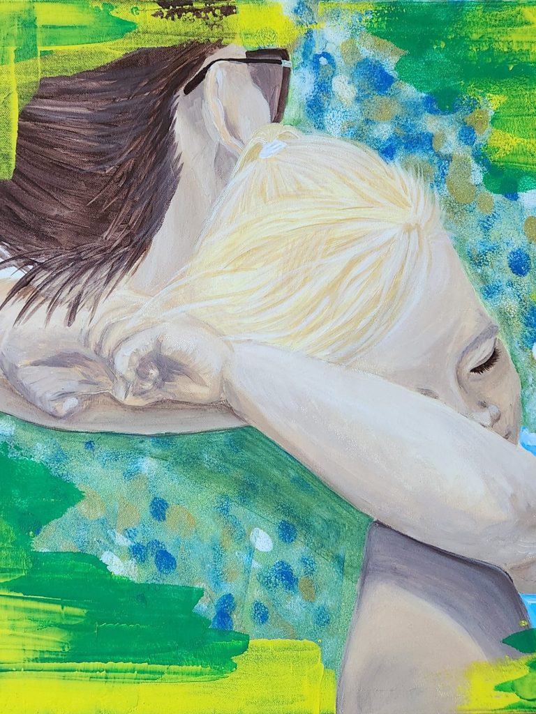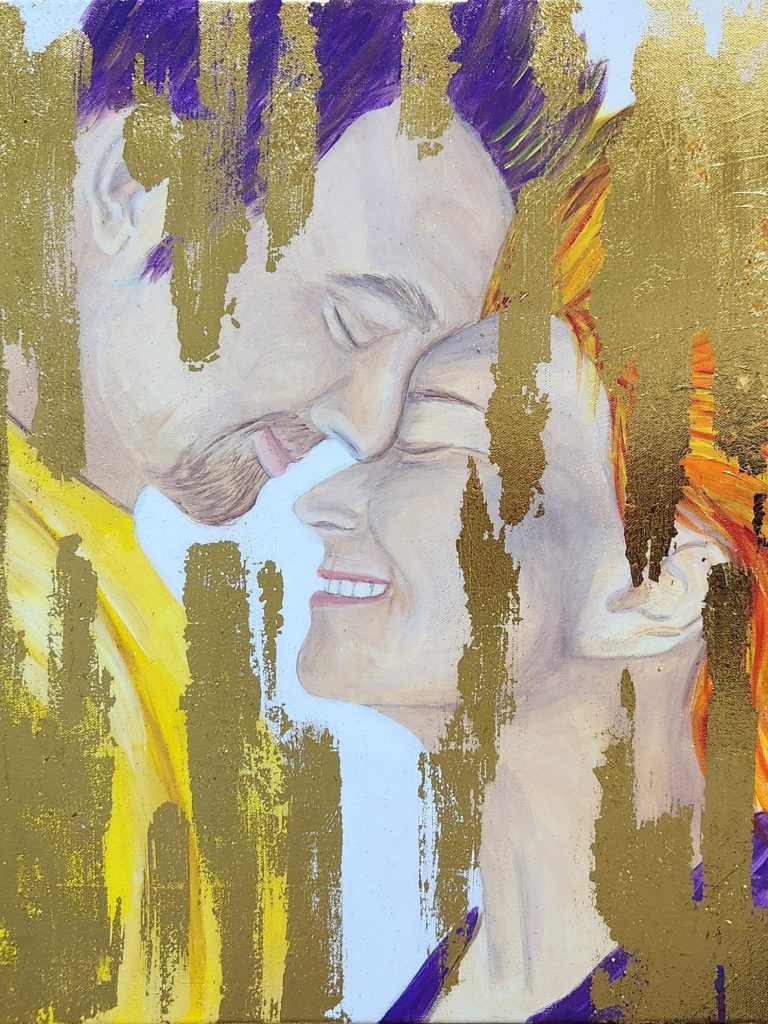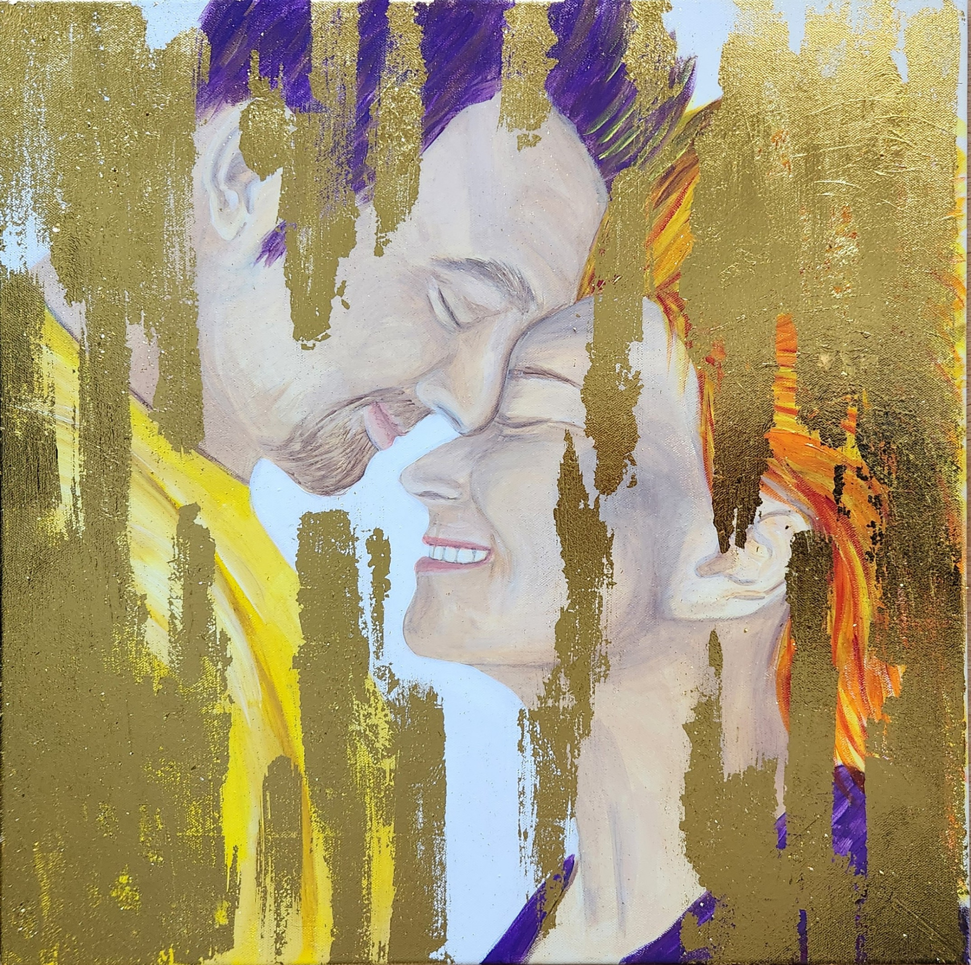 Two profiles meet in stillness, their closed eyes and subtle smiles held within vertical traces of gold that reflect light like quiet devotion. The painting resonates with acceptance and inner alignment, suggesting harmony that exists without effort or explanation. In a room, it creates a subtle center of calm, as if the wall itself were breathing more slowly.