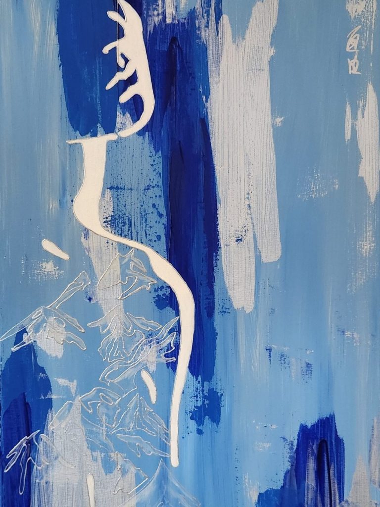 Solitude in Blue rests on the wall with a quiet clarity, its layered blues holding light while the white figure seems to pause between presence and distance. The surface invites a slower gaze, offering a sense of calm that carries a trace of melancholy, like standing among mountains that listen without responding. It belongs naturally in spaces where silence is valued, where thoughts are allowed to unfold without urgency.
