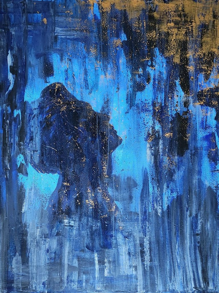 Light Remains holds a quiet presence on the wall, where deep blues absorb the surrounding space and soft traces of gold seem to hover, catching light as the day moves. The work carries a gentle emotional weight, offering a moment of stillness in which grief, gratitude, and memory can exist without urgency or resolution. It lives well in spaces that allow for pause, where looking becomes a form of listening and light is permitted to linger.