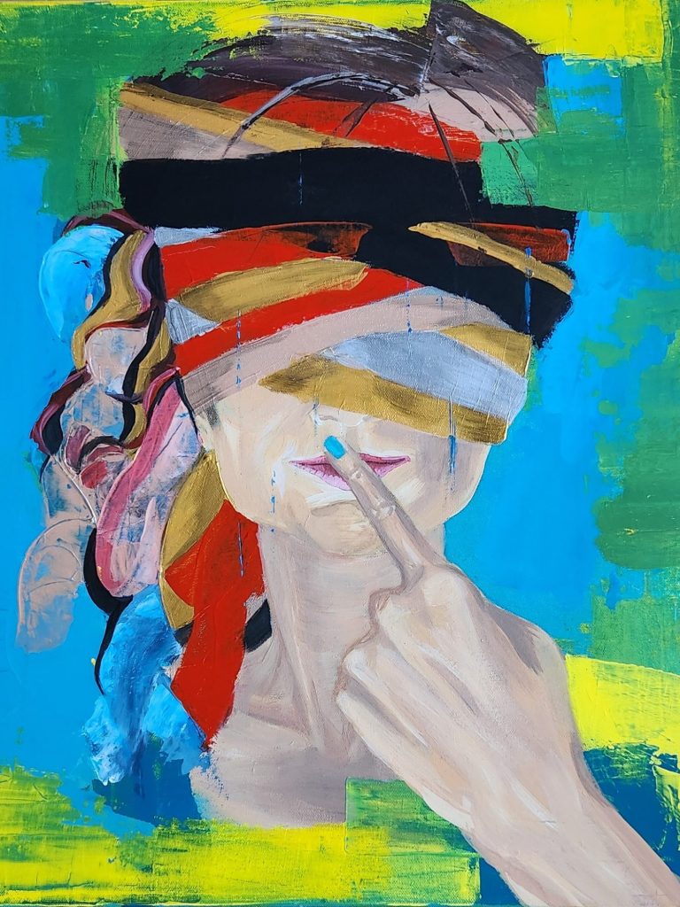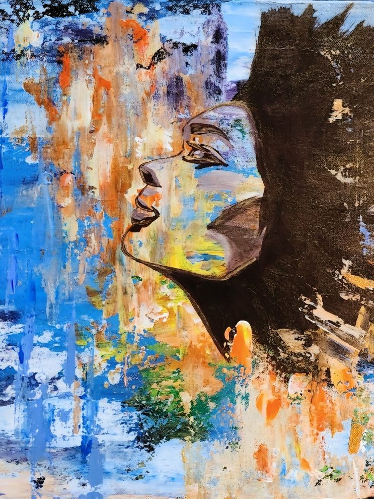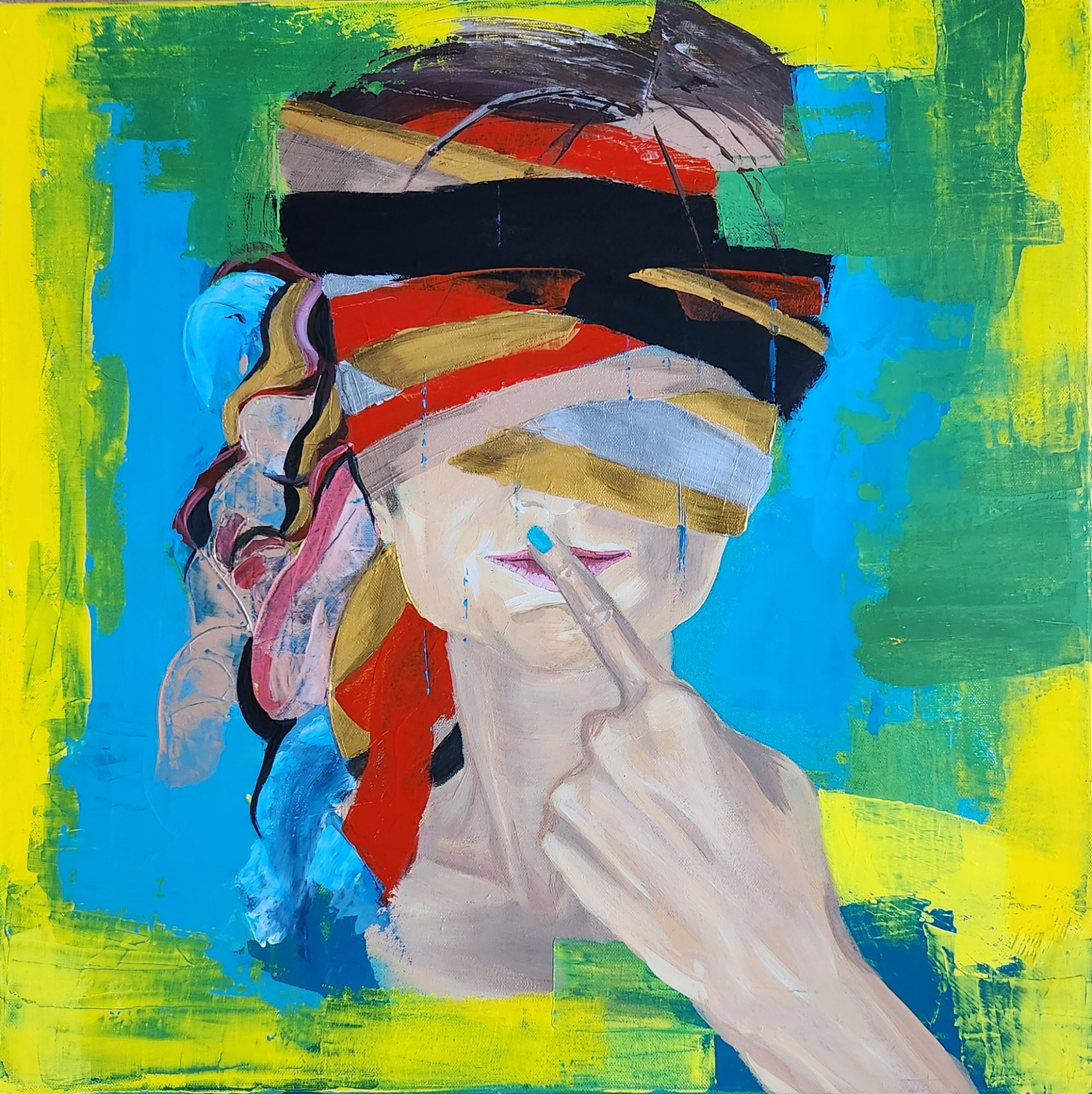 Layers of color and textured matter gather around the head like a suspended inner landscape, catching light and holding it in quiet tension. The covered gaze and the gesture of silence draw the viewer inward, toward a space where thoughts soften and creation begins before words. On a wall, the painting feels contemplative, as if it listens as much as it speaks.
