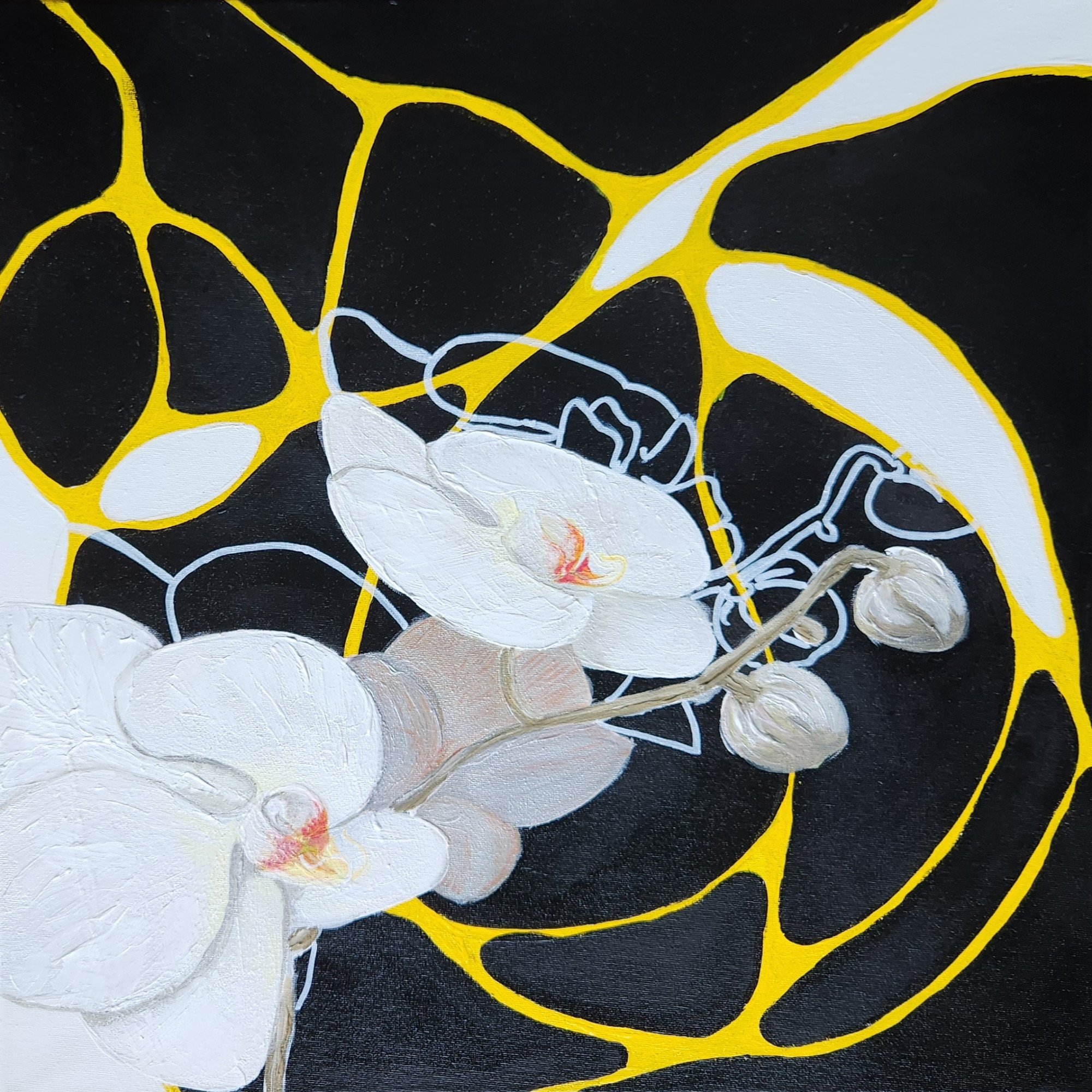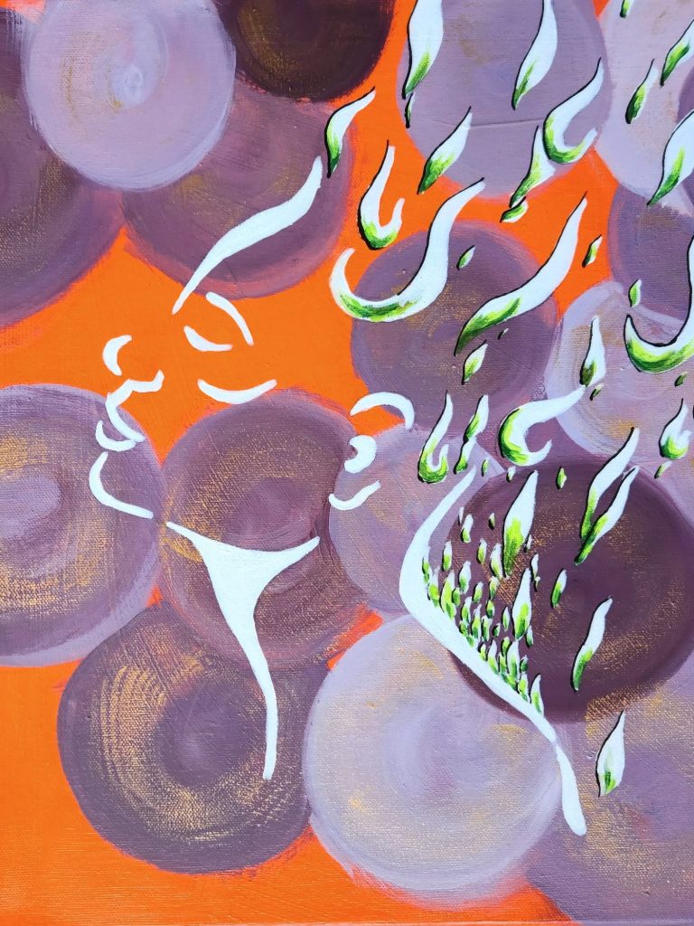 Light moves gently across the orange ground and violet circles, allowing the white form to hover between presence and absence on the wall. The painting holds a calm tension, as if something within it has just been released and has not yet fully settled. It invites a space that values pauses, inner clarity, and the courage to begin quietly.