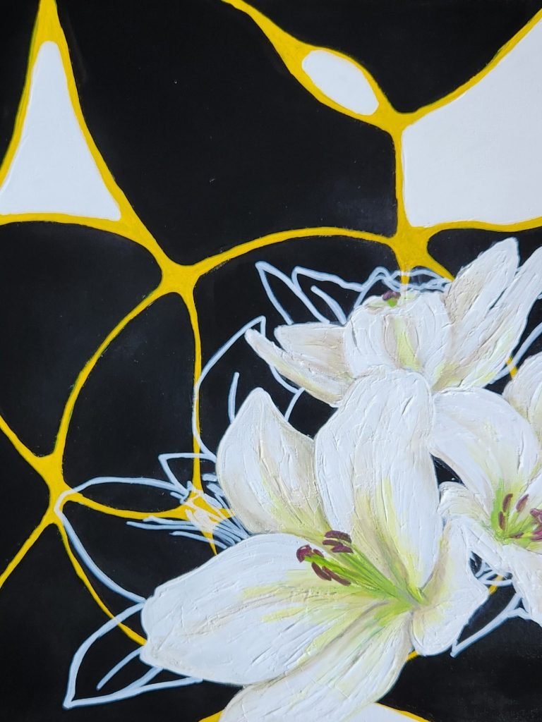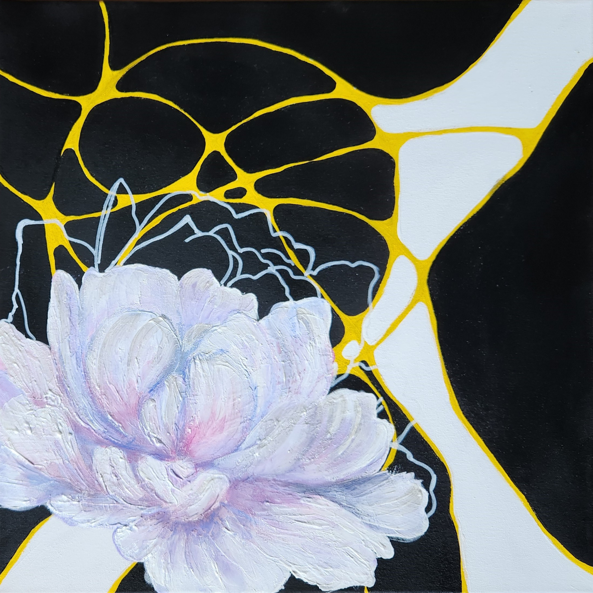 Soft black and white surfaces are held together by fine golden lines that reveal themselves only as the light shifts across the wall.
