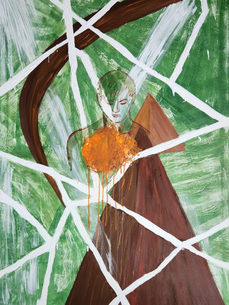 The fractured figure and pyramids create a still tension that invites reflection on strength, vulnerability, and the unseen movement within.