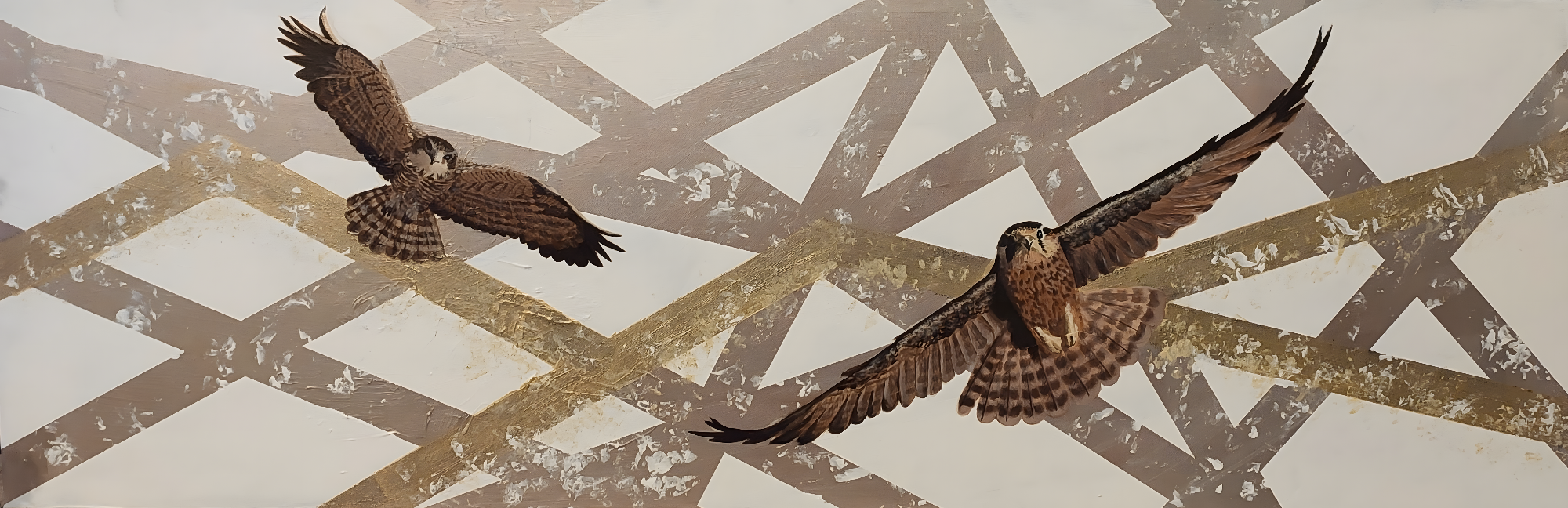 Two falcons move through a field of warm light, their bodies suspended between heat and air, the surface holding both distance and closeness at once. The space around them feels steady and open, carrying a quiet confidence that settles rather than calls.