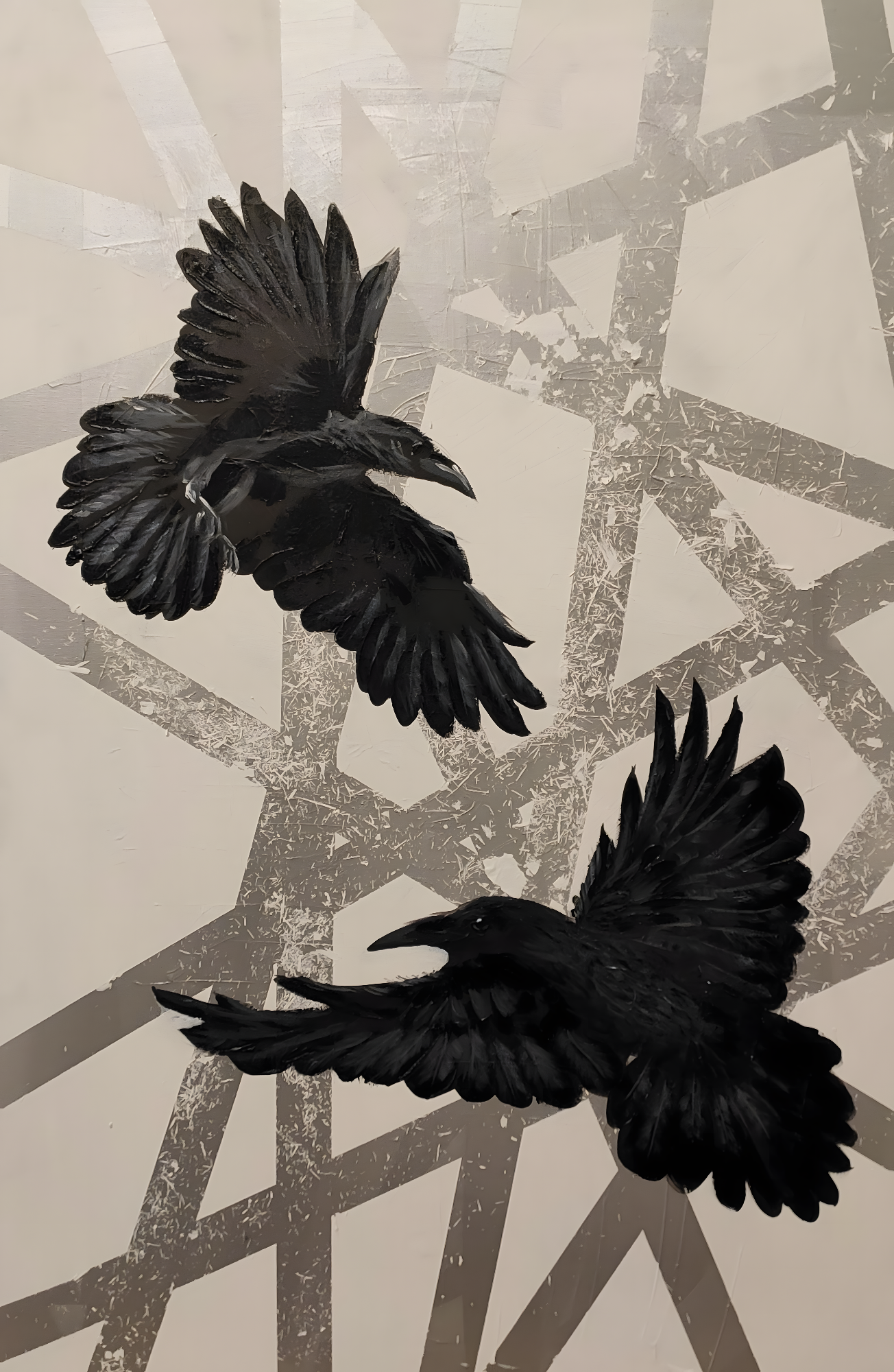 Two ravens move through an open field of air and distance, their dark forms holding the light rather than breaking it.