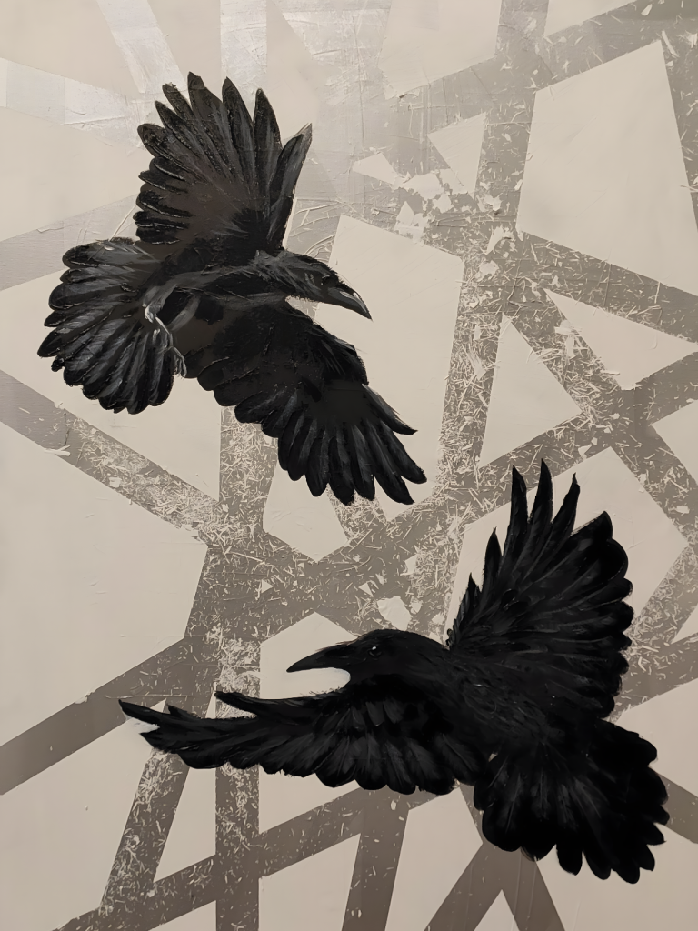 Through birds as metaphors — ravens, falcons, cranes, and kingfishers — each painting reveals a story of movement and stillness, clarity and ambiguity.