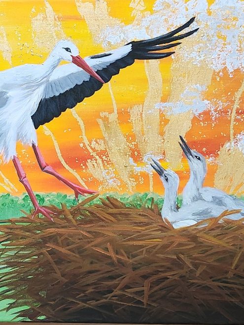 High above the treetops, a nest rests in open light, held between sky and field, its edges clearly visible against the quiet depth of space. The painting carries a feeling of calm alertness, where steadiness and vulnerability exist side by side without conflict.