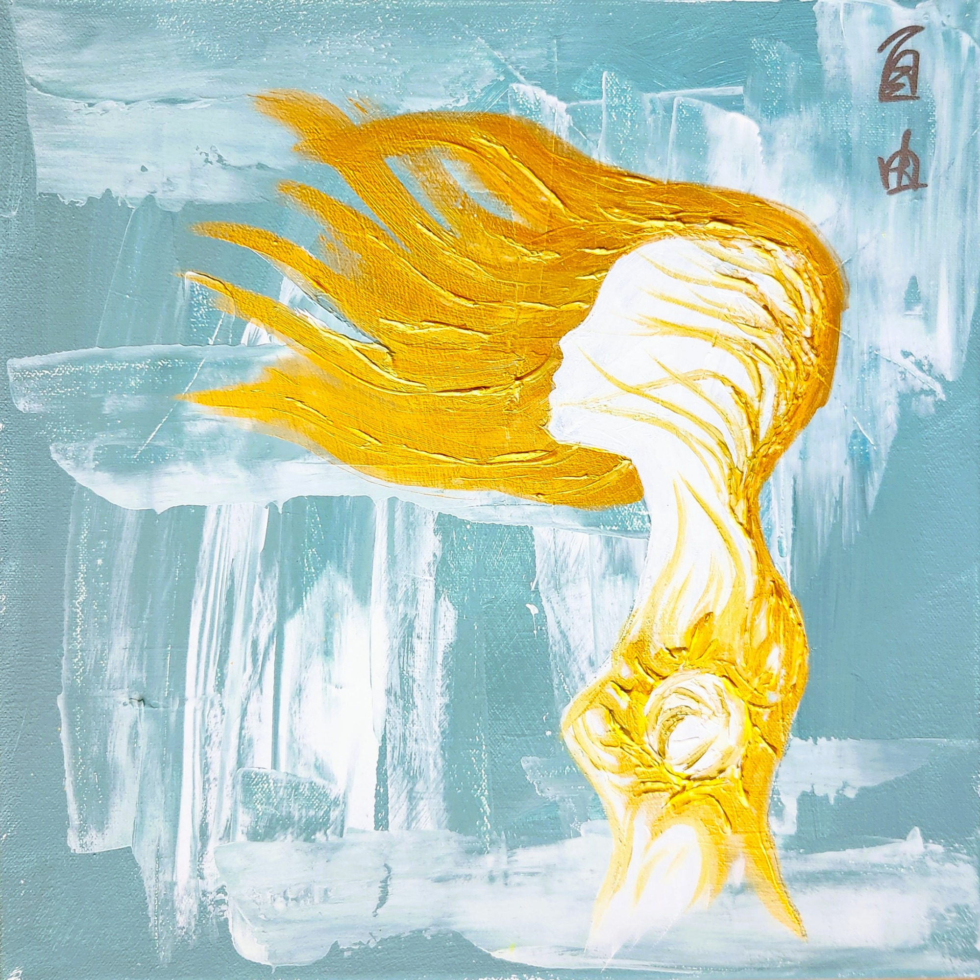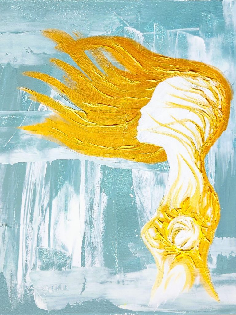 This painting holds light in layered blues and warm traces of gold, meeting the wall with a quiet sense of movement and openness. Its presence feels steady and gently expansive, inviting reflection on inner freedom, resilience, and the subtle courage to remain uncontained. It belongs in a space where time slows slightly, where attention can rest, and where thought is allowed to soften into presence.