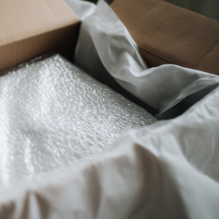 The painted surface is first protected with a layer of tissue paper, followed by bubble wrap to cushion the artwork during transport. Corners and edges receive additional protection using polyethylene foam elements.